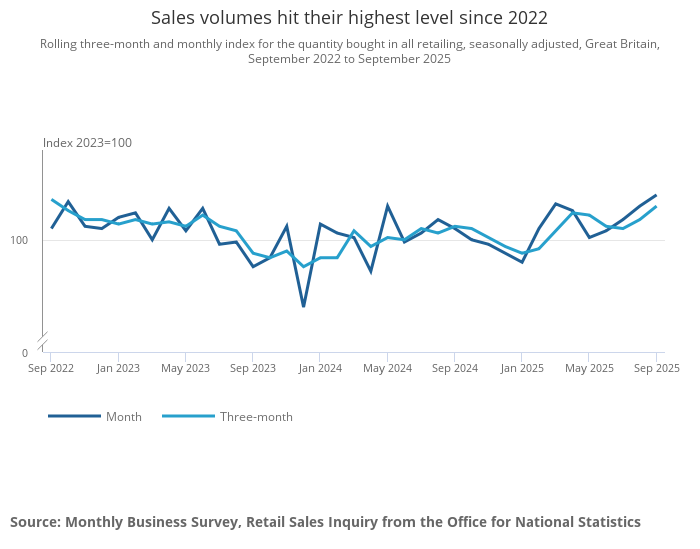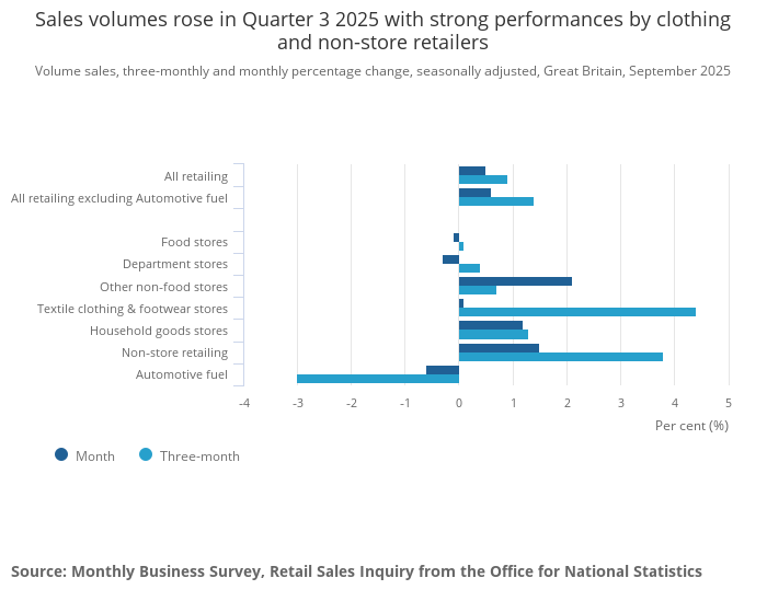 Sales volumes rose in Quarter 3 2025 with strong performances by clothing and non-store retailers