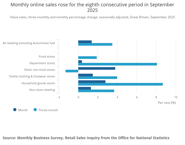 Total spend (the sum of in-store and online sales) rose by 0.7% over the month. As a result, the proportion of sales made online increased from 27.8% in August 2025 to 28.0% in September 2025.