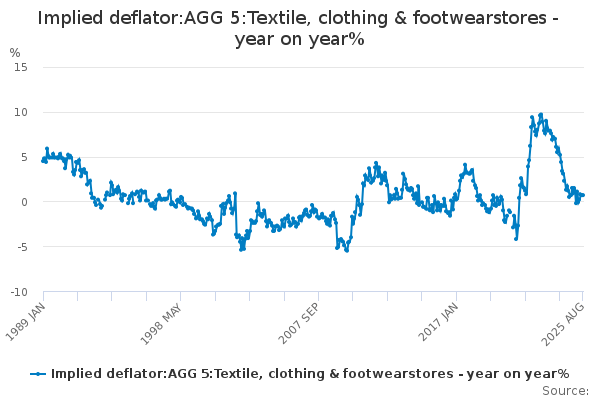 Download this time seriesImplied deflator:AGG 5:Textile, clothing & footwearstores - year on year%