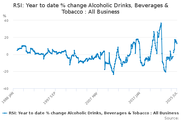 Download this time seriesRSI: Year to date % change Alcoholic Drinks, Beverages & Tobacco : All Business
