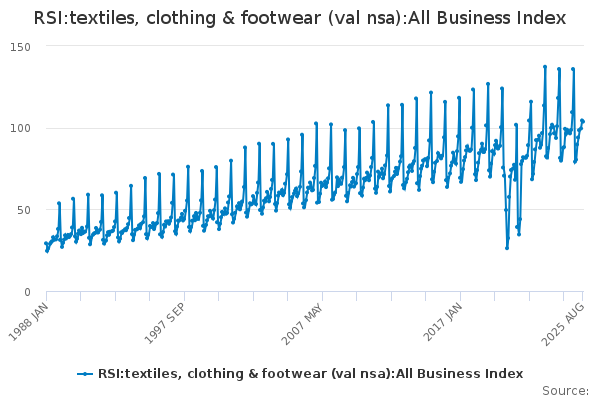 Download this time seriesRSI:textiles, clothing & footwear (val nsa):All Business Index