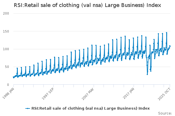 Download this time seriesRSI:Retail sale of clothing (val nsa) Large Business) Index
