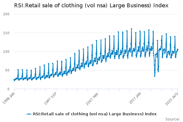 Download this time seriesRSI:Retail sale of clothing (vol nsa) Large Business) Index