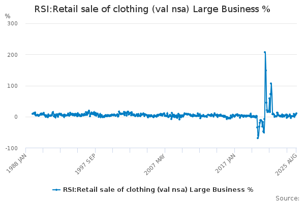 Download this time seriesRSI:Retail sale of clothing (val nsa) Large Business %