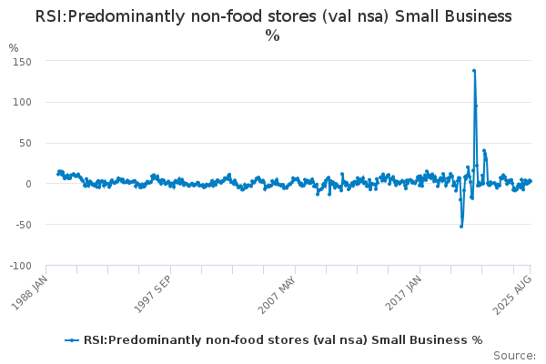 Download this time seriesRSI:Predominantly non-food stores (val nsa) Small Business %