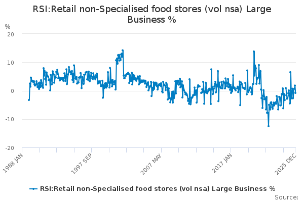 Download this time seriesRSI:Retail non-Specialised food stores (vol nsa) Large Business %