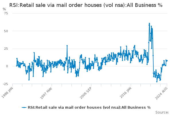 Download this time seriesRSI:Retail sale via mail order houses (vol nsa):All Business %