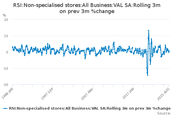 Download this time seriesRSI:Non-specialised stores:All Business:VAL SA:Rolling 3m on prev 3m %change