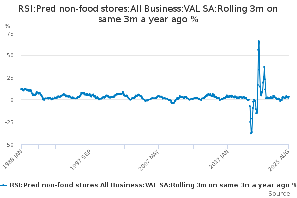 Download this time seriesRSI:Pred non-food stores:All Business:VAL SA:Rolling 3m on same 3m a year ago %