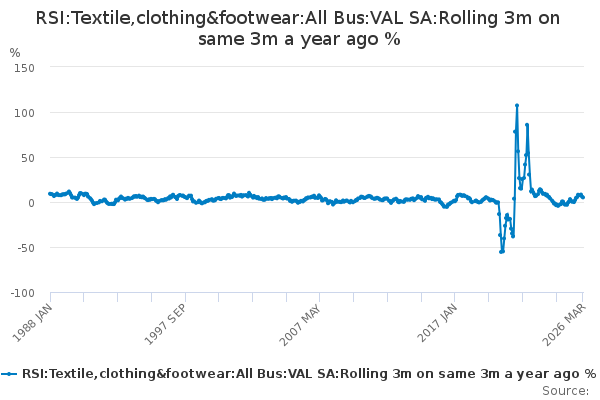 Download this time seriesRSI:Textile,clothing&footwear:All Bus:VAL SA:Rolling 3m on same 3m a year ago %