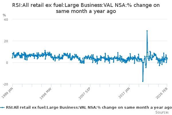 Download this time seriesRSI:All retail ex fuel:Large Business:VAL NSA:% change on same month a year ago