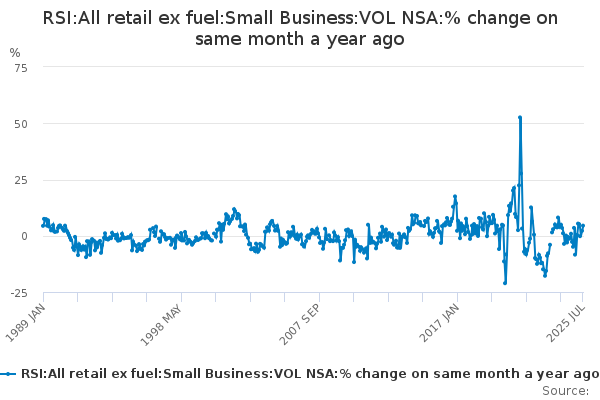 Download this time seriesRSI:All retail ex fuel:Small Business:VOL NSA:% change on same month a year ago
