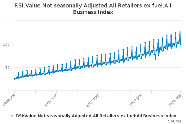 Download this time seriesRSI:Value Not seasonally Adjusted:All Retailers ex fuel:All Business Index