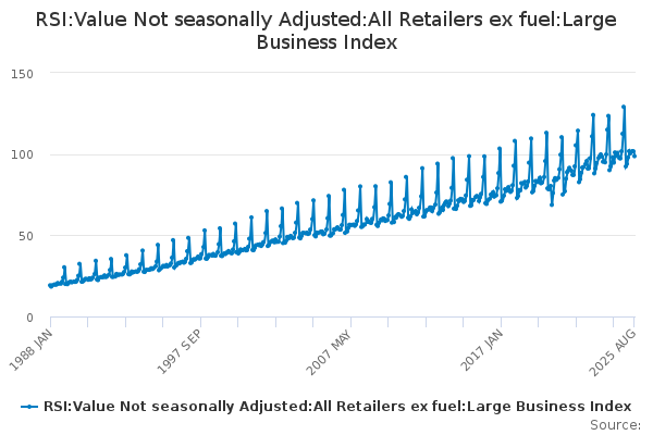 Download this time seriesRSI:Value Not seasonally Adjusted:All Retailers ex fuel:Large Business Index