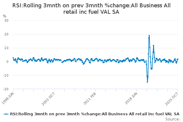 Download this time seriesRSI:Rolling 3mnth on prev 3mnth %change:All Business All retail inc fuel VAL SA