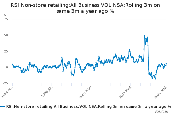 Download this time seriesRSI:Non-store retailing:All Business:VOL NSA:Rolling 3m on same 3m a year ago %