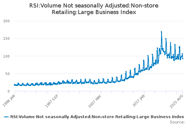 Download this time seriesRSI:Volume Not seasonally Adjusted:Non-store Retailing:Large Business Index