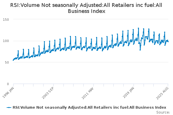 Download this time seriesRSI:Volume Not seasonally Adjusted:All Retailers inc fuel:All Business Index