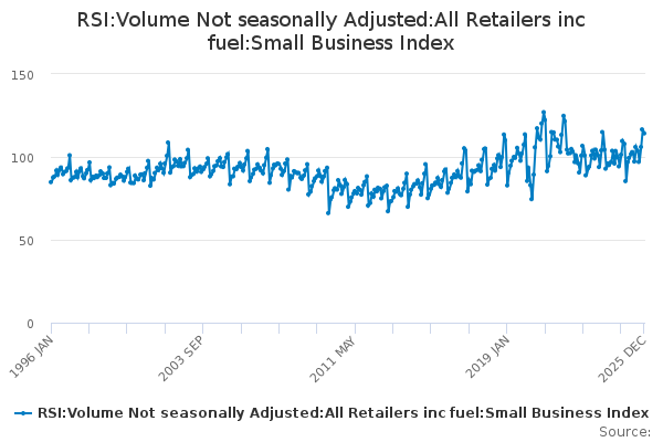 Download this time seriesRSI:Volume Not seasonally Adjusted:All Retailers inc fuel:Small Business Index