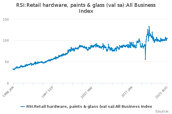 Download this time seriesRSI:Retail hardware, paints & glass (val sa):All Business Index
