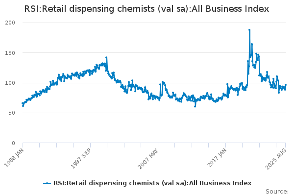 Download this time seriesRSI:Retail dispensing chemists (val sa):All Business Index