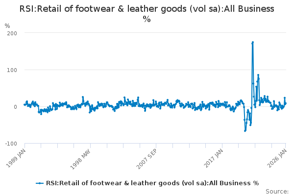 Download this time seriesRSI:Retail of footwear & leather goods (vol sa):All Business %