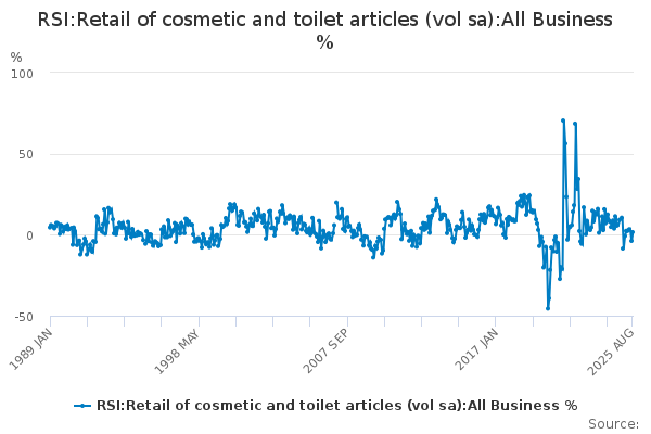 Download this time seriesRSI:Retail of cosmetic and toilet articles (vol sa):All Business %
