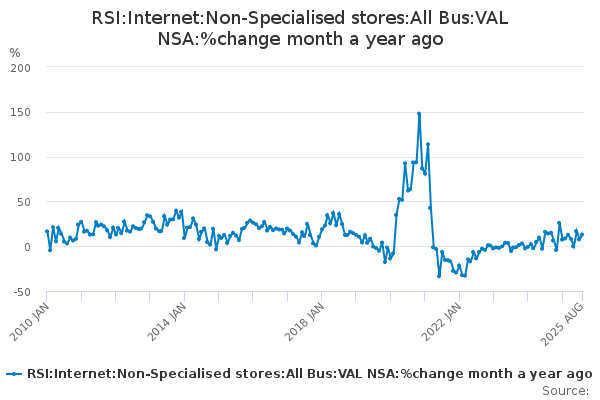 Download this time seriesRSI:Internet:Non-Specialised stores:All Bus:VAL NSA:%change month a year ago