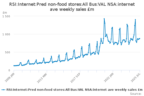 Download this time seriesRSI:Internet:Pred non-food stores:All Bus:VAL NSA:internet ave weekly sales £m