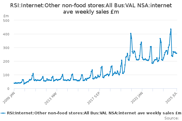 Download this time seriesRSI:Internet:Other non-food stores:All Bus:VAL NSA:internet ave weekly sales £m