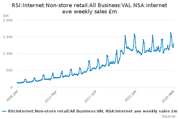 Download this time seriesRSI:Internet:Non-store retail:All Business:VAL NSA:internet ave weekly sales £m