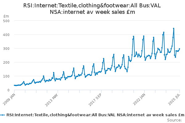 Download this time seriesRSI:Internet:Textile,clothing&footwear:All Bus:VAL NSA:internet av week sales £m