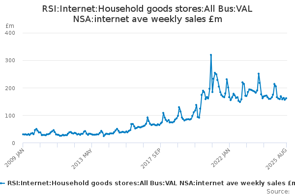Download this time seriesRSI:Internet:Household goods stores:All Bus:VAL NSA:internet ave weekly sales £m
