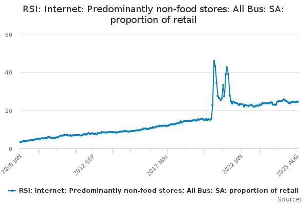 Download this time seriesRSI: Internet: Predominantly non-food stores: All Bus: SA: proportion of retail