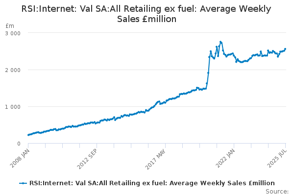 Download this time seriesRSI:Internet: Val SA:All Retailing ex fuel: Average Weekly Sales £million