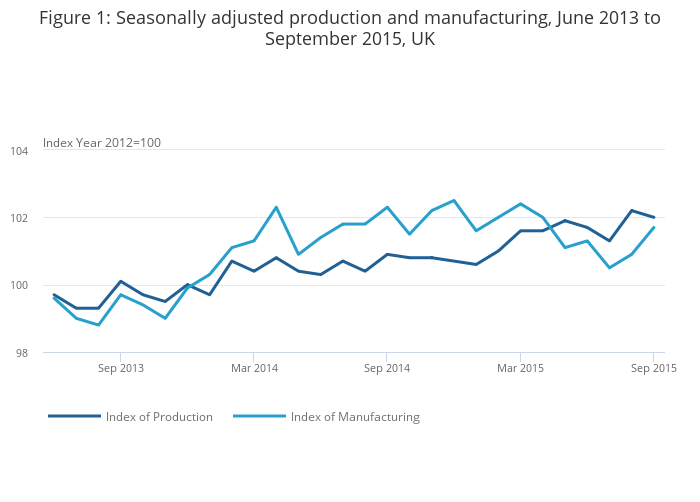 In 2015, the performance of the manufacturing industry has been more volatile than that of the Index of Production (IoP) as a whole. Despite a moderate increase from July to August 2015 and a strong increase between August and September 2015, manufacturing output is only slightly above the level seen at the start of the year (for more information and analysis of the latest figures see the production and sectors supplementary analysis section of the bulletin).
