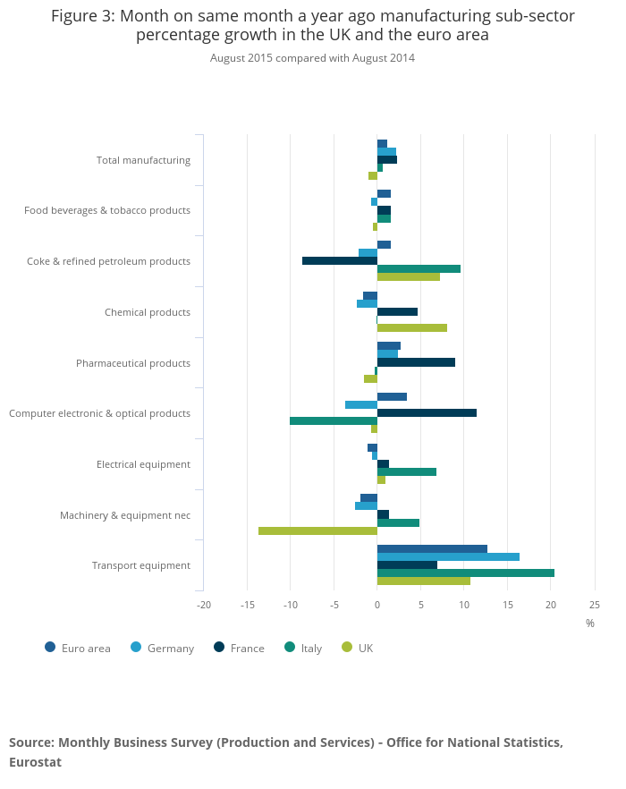 Figure 3 presents month on same month a year ago growth rates in 8 of the 13 UK manufacturing sub-industries for August 2015, alongside comparable growth rates achieved in Germany, France, Italy and the euro area. This shows that the UK manufacturing output contracted by 0.9%, compared with total euro area manufacturing growth of 1.2%. Manufacturing output also increased in France, Germany and Italy by 2.3%, 2.2% and 0.7% respectively.