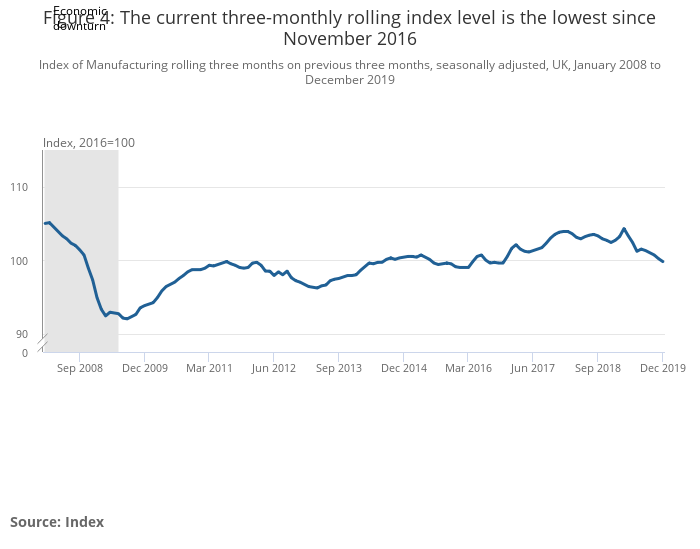 Image .csv .xlsGrowth for the Index of Manufacturing (IoM) was more pronounced from the beginning of 2010, as the economy recovered from the 2008 economic downturn, before a downturn during 2012. Manufacturing output in the UK remained 4.5% lower in Quarter 4 (Oct to Dec) 2019 than the pre-downturn peak in Quarter 1 (Jan to Mar) 2008. Additionally, the current three-monthly rolling index level is the lowest since November 2016.