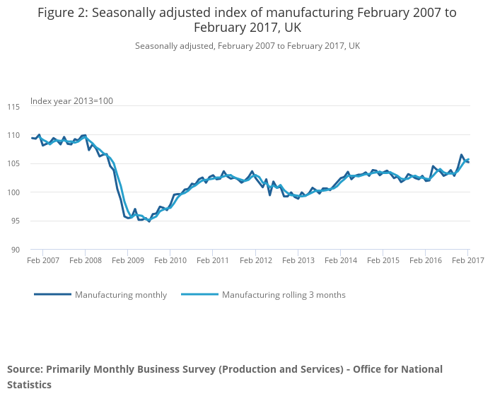 In the 3 months to February 2017, manufacturing increased by 2.1% (unchanged from the 3 months to January 2017), continuing its strongest growth since May 2010 – total production was estimated to have increased by 1.6%, with manufacturing providing the largest contribution.