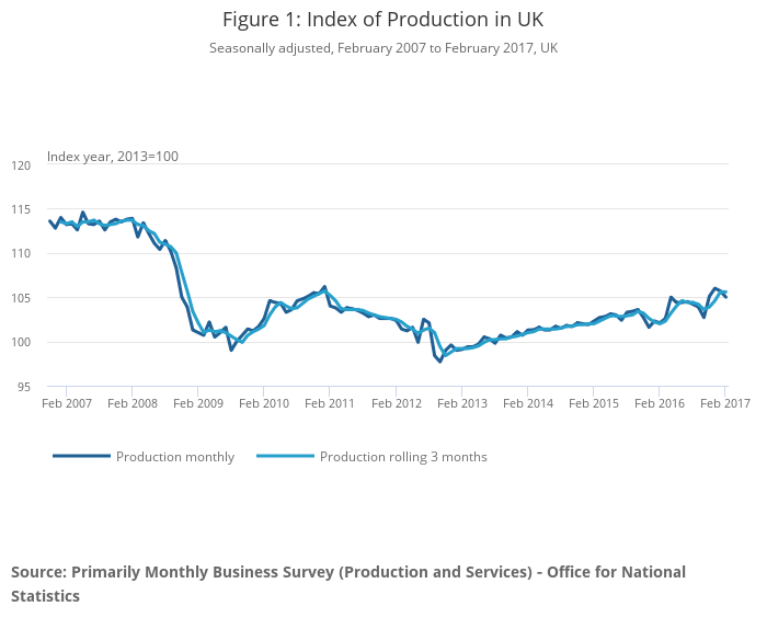 Short-term indicators economic commentary was published alongside this release, presenting new information on economic conditions in February 2017, with data available for output in production, construction and the trade balance.