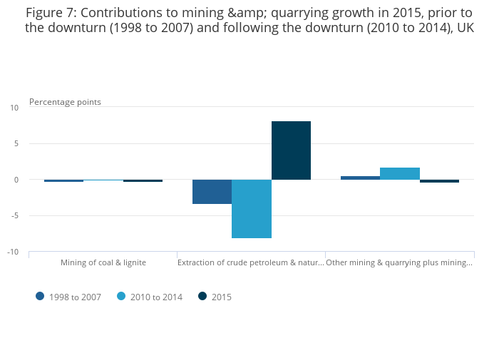 Historically the extraction of crude petroleum and natural gas has made negative contributions to mining & quarrying, on average there were decreases of 3.4 percentage points in the pre-downturn period (from 1998 to 2007) and 8.1 percentage points in the post-downturn period (from 2010 to 2014). However, in 2015 its performance may have been boosted by government reforms announced in the March Budget 2015 and Summer Budget 2015. These reforms included, among others, the introduction of a new investment allowance, a reduction in the supplementary charge from 30% to 20% and a reduction in the petroleum revenue tax from 50% to 35%. Moreover, the Department for Energy and Climate Change (DECC) cited that UK dependence on crude oil imports had decreased in 2015 as a result of a new UK oil field (Golden Eagle) coming online and maintenance issues not affecting 2015 production levels as severely as they did in 2014 (Energy Trends section 3: oil and oil products).