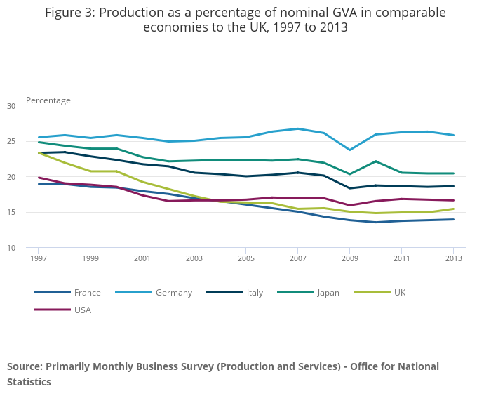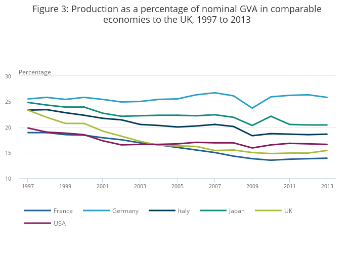 Image .csv .xlsFigure 3 shows the share of nominal gross value added (GVA) accounted for by production in the UK and a selection of other major economies (more information on data for France, Germany, Italy, Japan and the USA can be found on the Organisation for Economic Co-operation and Development (OECD) website). In 1997, the share of nominal GVA accounted for by production in the UK was 23.3%, around the middle of the range relative to the other economies. By 2013, the UK had become relatively less reliant on production, as its share fell to 15.4% of nominal GVA.