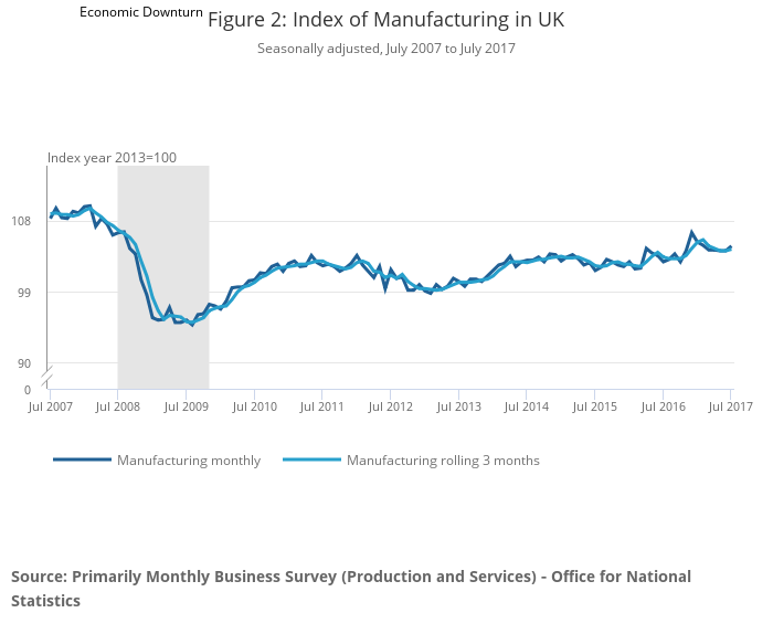Figures 1 and 2 show that both the Index of Production (IoP) and Index of Manufacturing (IoM) followed a broadly upward trend following the economic downturn. Growth was more pronounced from the beginning of 2010, as the economy recovered, before a downturn during 2012. Since then, both production and manufacturing output have risen but remain well below their level reached in the pre-downturn gross domestic product (GDP) peak in Quarter 1 (Jan to Mar) 2008, by 7.6% and 4.3% respectively in the 3 months to July 2017.