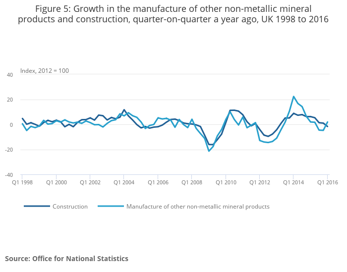 In Quarter 1 (Jan to Mar) 2016, production and manufacturing output remained below their Quarter 1 (Jan to Mar) 2008 levels by 10.0% and 6.9%, respectively. Moreover, in Quarter 1 (Jan to Mar) 2016, mining & quarrying and electricity, gas, steam & air conditioning output, which continued to decline following the downturn, were 32.5% and 12.2% below their respective values in Quarter 1 (Jan to Mar) 2008. In contrast, water supply, sewerage & waste management is the only main sector within production to have surpassed its value in Quarter 1 (Jan to Mar) 2008, by 11.7%, as of Quarter 1 (Jan to Mar) 2016.