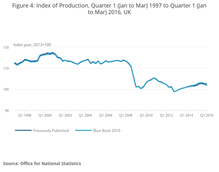 The Blue Book 2016 revisions, which go back to January 1997, have affected the Index of Production (IoP) and its components. The main sources of the revision are the annual update of weights and seasonal adjustment models, re-referencing of the published indices from 2012 to 2013, methodological improvements and updated source data. As is common for the first IoP publication following the annual updates, there are larger revisions than in an ordinary publication.