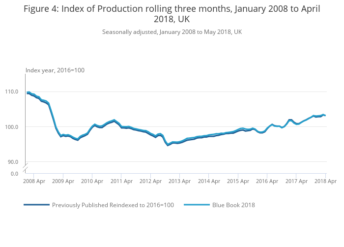 .xls (44.0 kB)The impact of the Blue Book 2018 revisions to the IoP affect the level of output over time. However, the profile and performance of production remained broadly unchanged from previously published when both indices are referenced to 2016 equals 100 (Figure 4). The larger divergences show from Quarter 1 (Jan to Mar) 2017, mainly as a result of incorporating updated source data and the introduction of an improvement to the methodology for non-response in the Monthly Business Survey, which underpins the Index of Production release, as detailed in Improving the methodology for survey non-response.