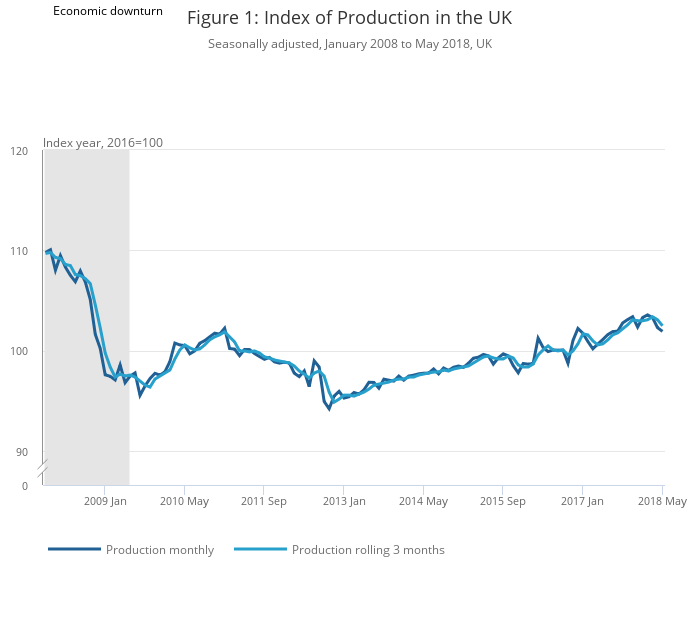 Figures 1 and 2 show that both the Index of Production (IoP) and Index of Manufacturing (IoM) followed a broadly upward trend following the economic downturn. Growth was more pronounced from the beginning of 2010, as the economy recovered, before a downturn during 2012. Production and manufacturing output have risen but remain 6.2% and 2.5% lower, respectively, in the three months to May 2018 than the pre-downturn gross domestic product (GDP) peak in Quarter 1 (Jan to Mar) 2008.