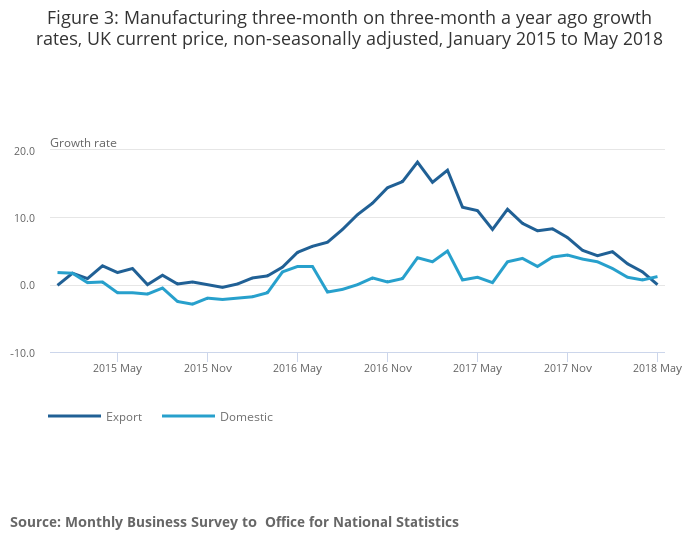 There is no notable growth for the three months to May 2018 compared with the same three months to February 2018, with output falling by 0.5%.