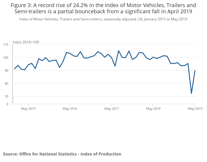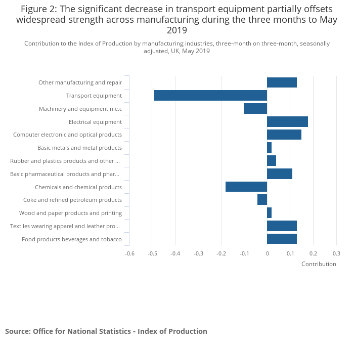 Partially offsetting the increase in overall manufacturing growth was a fall of 7.4% within transport equipment. Additionally, The Society of Motor Manufacturers and Traders (SMMT) have reported a decline in the number of cars manufactured for domestic and export markets during May 2019 compared with May 2018.