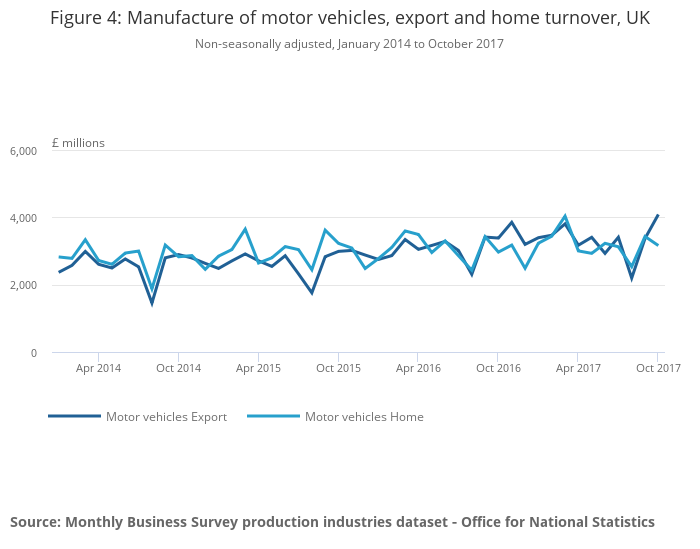 Motor vehicles, trailers and semi-trailers provided a similar contribution and rose by 6.3%. An increase in export turnover of 20.7% was reported by this sub-industry compared with October 2016; this was published in the MBS production industries dataset alongside this release. Figure 4 shows a steady improvement in export turnover over a longer time span, in comparison with domestic turnover, which remains relatively subdued. Within the MBS production industries dataset, the value of exports for the motor vehicle, trailers and semi-trailers were at a record level in October 2017, exceeding £4 billion for the first time. However, it is important to note that this dataset is based on current prices and does not reflect the impact of prices, and is not seasonally adjusted.